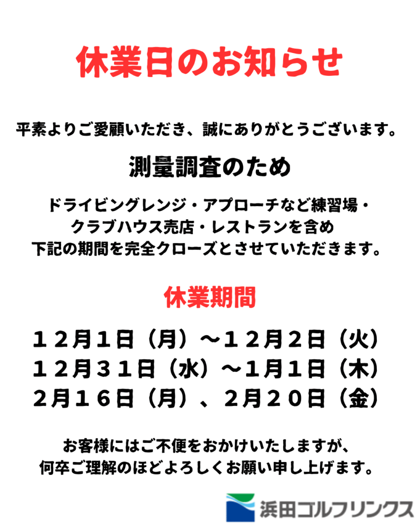 ドライビングレンジ・アプローチなど練習場・クラブハウス売店・レストランを含め 下記の期間を完全クローズとさせていただきます。