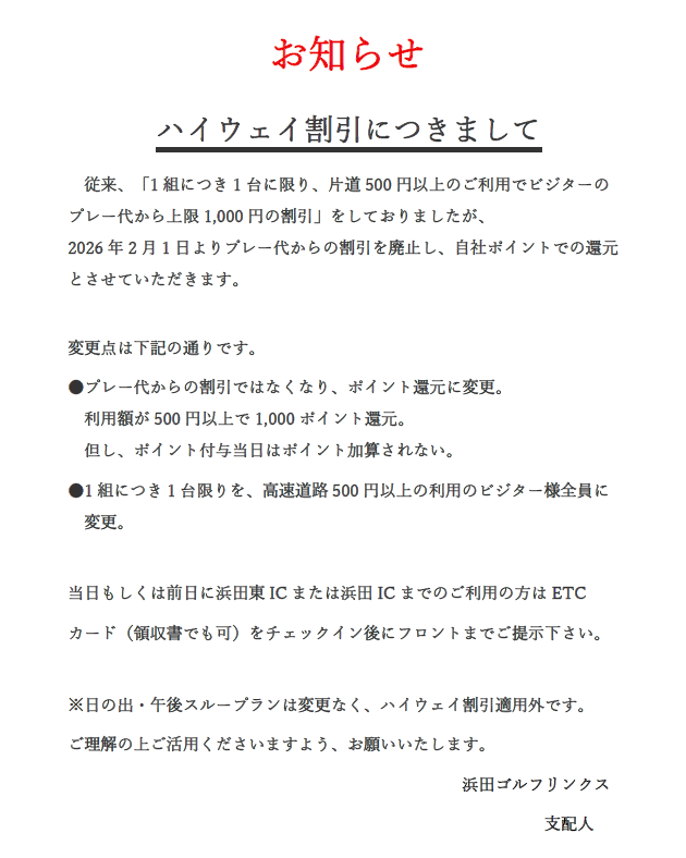 これまで実施しておりました「プレー代からの割引」を廃止し、今後は自社ポイントによる還元へ変更いたします。【ポイント還元について】