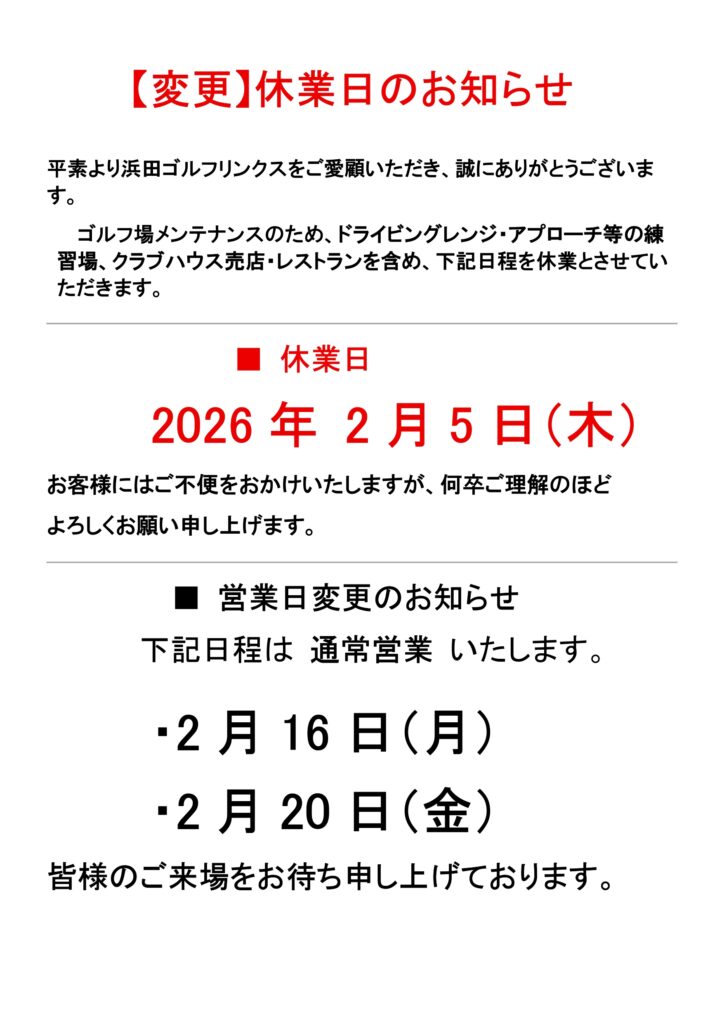 ドライビングレンジ・アプローチなど練習場・クラブハウス売店・レストランを含め 下記の期間を完全クローズとさせていただきます。
