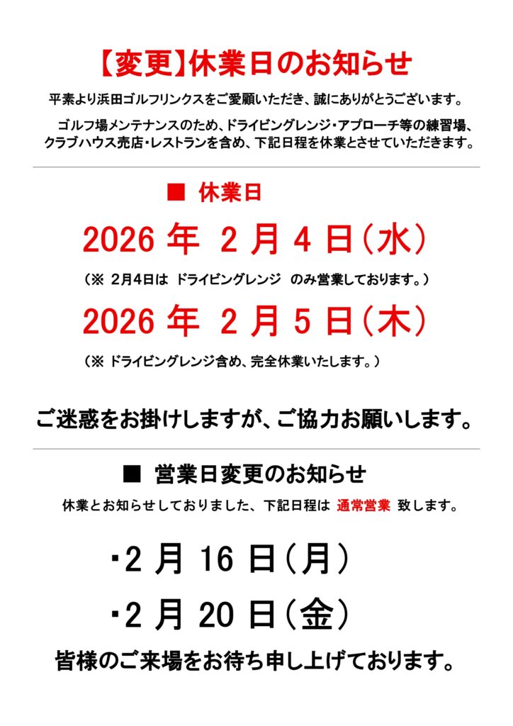 2026年2月5日(木)(※ ドライビングレンジ含め、完全休業いたします。)